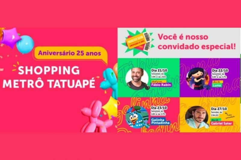 Aniversário tem que ter festa, não é mesmo? Ainda mais se as crianças forem convidadas para cantar Parabéns! Por isso, se liga nesse programão: os 25 anos do Shopping Metrô Tatuapé.