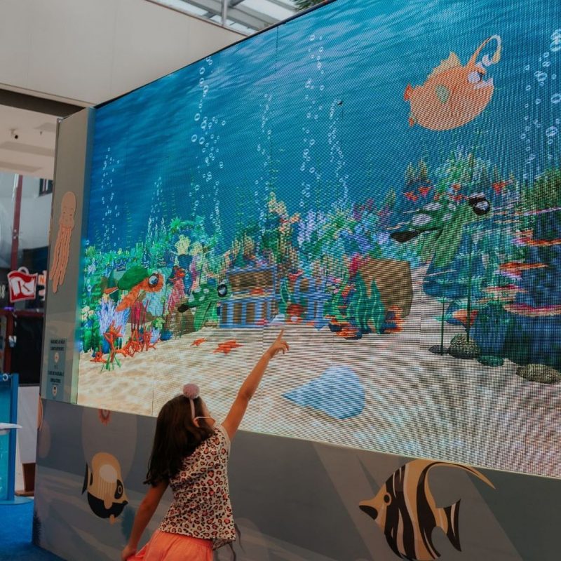 Na atração, as crianças recebem um desenho de um animal marinho para colorir. Após os pequenos artistas finalizarem o trabalho, as obras são digitalizadas em uma impressora em até três segundos e transmitidas no painel de led, onde são projetadas em cenários com imagens do fundo do mar em um vídeo wall de alta resolução, com 5 metros de altura e 2 de largura.
