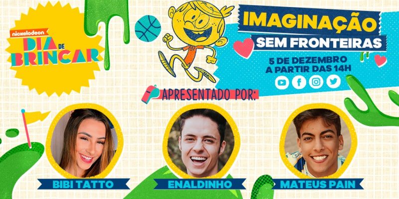 A Nickelodeon acaba de anunciar um time de youtubers para apresentar a quinta edição do Dia de Brincar, que será totalmente virtual, por conta da pandemia. Bibi Tatto, Enaldinho e Matheus Pain serão responsáveis por conduzir as crianças nos desafios, jogos educativos e sociais, que serão reproduzidos em casa. O tema do Dia de Brincar deste ano é “Imaginação Sem Fronteiras” e tem o objetivo de estimular a criatividade nos pequenos. O evento acontece no dia 5 de dezembro, a partir das 14h, pelas redes sociais da Nick, e às 15h, com entradas ao vivo no canal, simultaneamente. O São Paulo Para Crianças já tinha anunciado o Dia de Brincar com antecedência