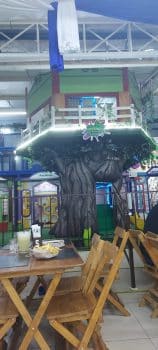 O espaço kids é fantástico, literalmente há uma vila infantil, com comércios fictícios fofos, piscina de bolinhas, escorregador e uma mega casa na árvore.