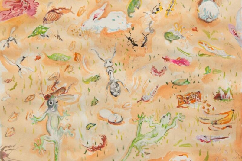 Tapete-Quintal: desenhado por Maria Klabin, o tapete reproduz um quintal com elementos para exploração detalhada, evocando a experiência de leitura dos livros de Clarice.
