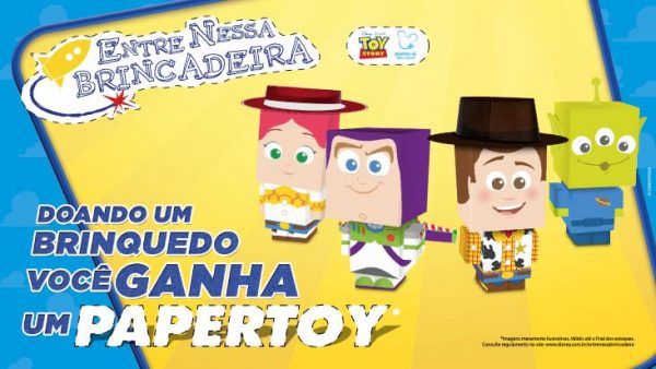 Essa é a 5ª edição, da campanha de doação de brinquedos “Entre Nessa Brincadeira” que começou no dia  12 de setembro. Você pode doar brinquedos novos ou usados, em bom estado de conservação, e ajudar a fazer uma criança mais feliz!  A cada doação, você recebe um papertoy de Toy Story.