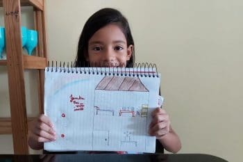 “Eu desenhei isso porque gosto muito de estudar e essa quarentena deixou a gente sem estudar. Então eu resolvi estudar para, quando voltar pra escola, eu estar melhor na leitura, na matemática. Eu me desenhei no quarto com um livro na mão estudando.” Maria Antônia Pena Costa, 10 anos – Fortaleza, CE