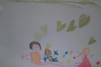 “Eu desenhei a minha família brincando de massinha, e corações porque eu tô gostando. A gente ia fazer os heróis de massinha. A gente tá dentro de casa porque não pode sair.” Sofia Baldinato, 5 anos – Carapicuíba, SP