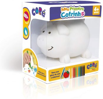 A primeira opção da lista é o modelo Meu primeiro Cofrinho, em formato de porquinho, da Toyster Brinquedos. Fabricado em material resistente e lavável, acompanha um kit de giz de cera sortido para a criançada guardar dinheiro e desenhar ao mesmo tempo!