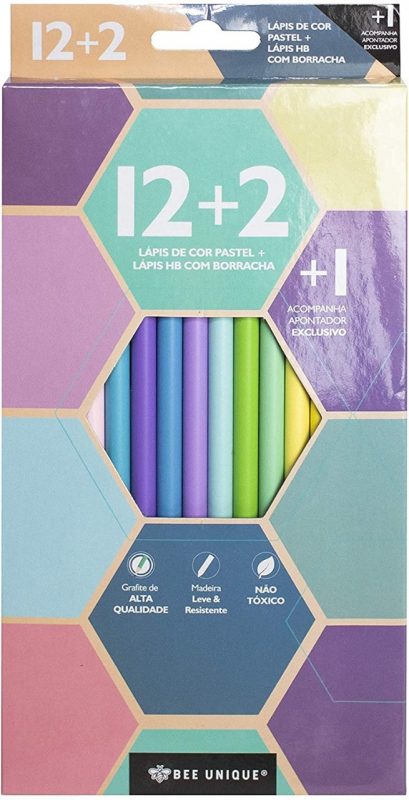 Já a Bee Unique também tem novidade para quem quer praticidade: seu estojo tem 12 lápis, mais 2 unidades de lápis Hb com borracha (ideais para desenhos artísticos, como retratos), e um apontador.