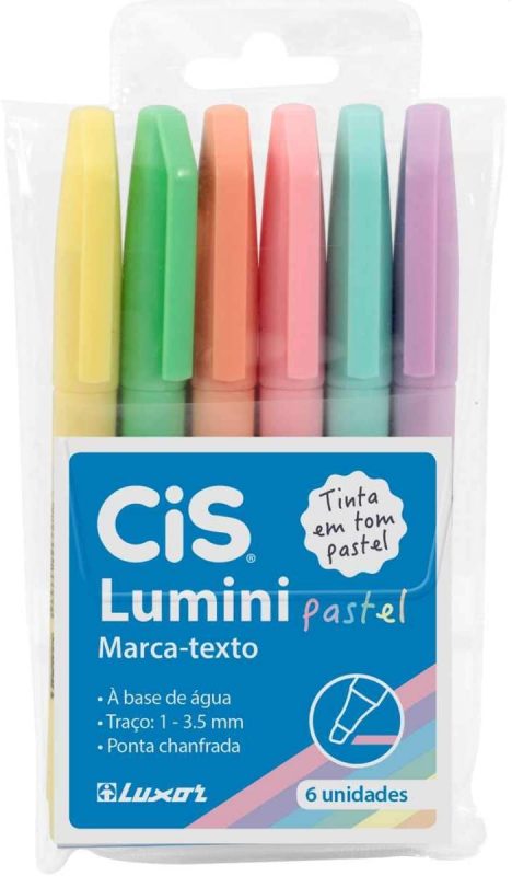As famosas canetas marca texto também estão na lista. A CIS conta com o estojo Lumini Pastel, com seis cores. Contém tinta à base d’água e a ponta “chanfrada”, perfeita para fazer efeitos, mesclando contornos mais grossos e finos ou simplesmente marcações na cartilha, livro ou caderno.