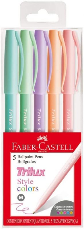 Agora, se as crianças querem complementar seus desenhos, com contornos especiais e acabamento perfeito, a dica é a caneta esferográfica Trilux Style Colors, da Faber-Castell. O estojo tem cinco cores em tons pastéis e tinta suave que facilita o deslize no papel.