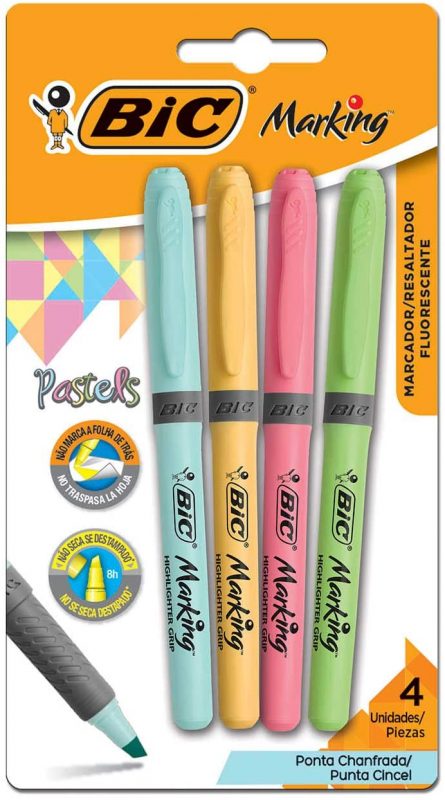 Outra opção de canetas marca texto em tons pastel são as BIC Marking, da BIC. O estojo tem quatro unidades: azul, amarelo, rosa e verde, e textura em plástico exclusiva para dar maior firmeza ao segurar.