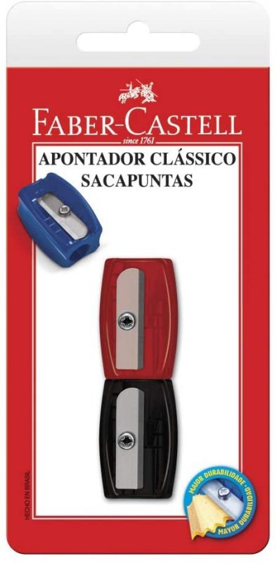 Outro item que não poderia ficar na lista é o apontador, né galerinha. E aquele pequeno, sem depósito, bem raiz. A Faber-Castell tem um kit com três unidades, azul, vermelho e preto.