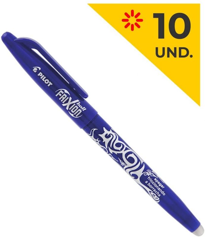 Tem também a famosa caneta apagável, da Pilot. Na cor azul, tem ponta em inox, tinta em gel e já vem com borracha na sua extremidade para apagar, se precisar. O estojo vem com 10 unidades!