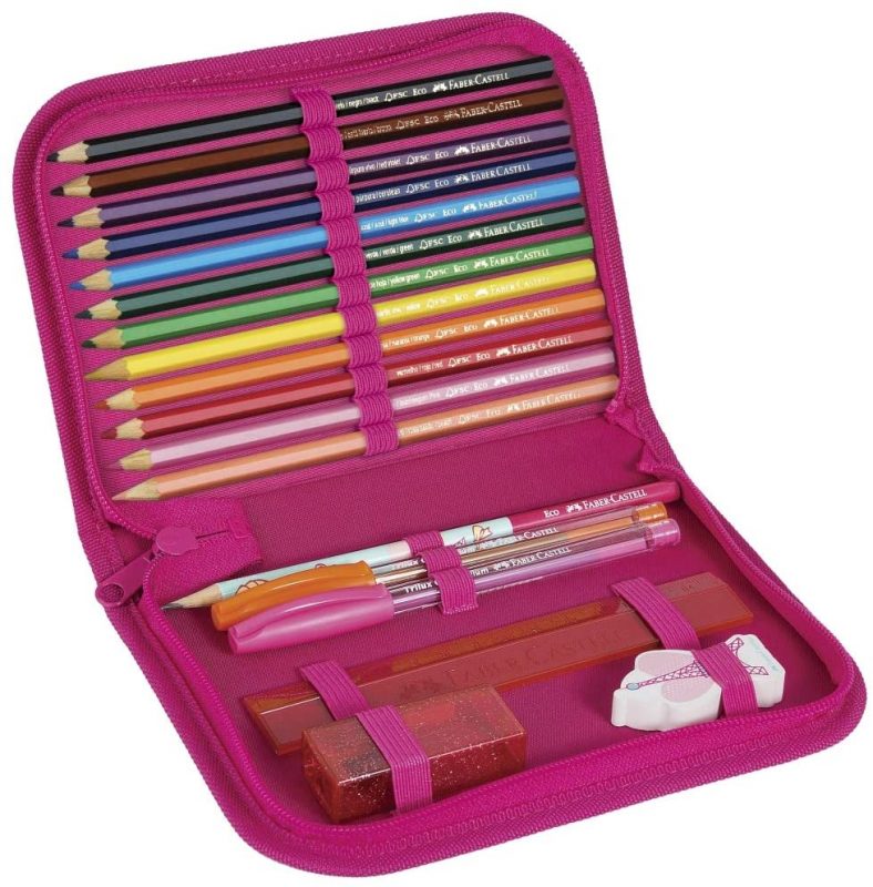 Se a questão é praticidade, a dica é o estojo em nylon que já vem com 12 lápis de cor sortidos, também da Faber-Castell. O kit vem com elásticos para prender não só os lápis, mas também o apontador, régua, borracha e canetas.