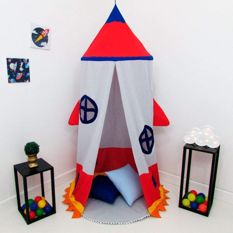 Alguém aí gosta de aventuras interestelares? Então, a dica é essa cabana que lembra um foguete! Isso mesmo. Além das estampas que reproduzem todos os compartimentos de uma nave, tem babado na parte baixa que faz menção às chamas dos propulsores, tapete e almofadas.