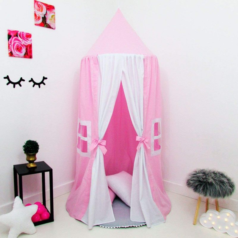 Para os pequenos que são mais meigos, a dica é a cabaninha com tons de rosa e teto que lembra um castelo. Tem duas janelinhas laterais, tapete macias e duas almofadas rosas e branca para deixar tudo mais confortável.