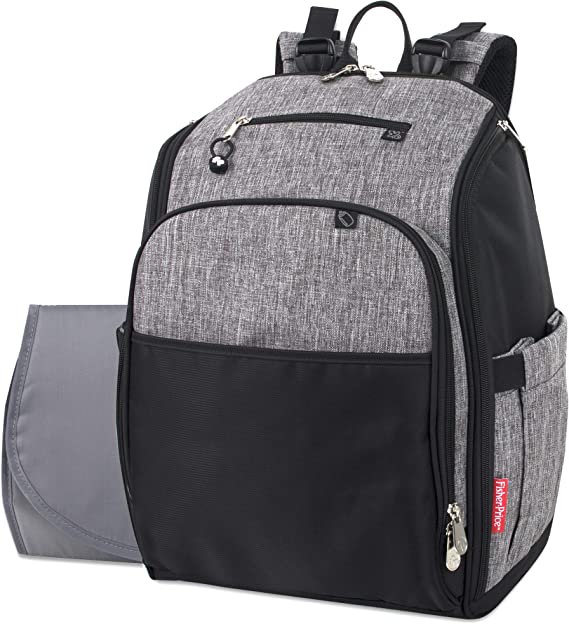 A mochila possui três bolsos embutidos para mamadeiras, além de um trocador portátil, alças traseiras e bolso para telefone.