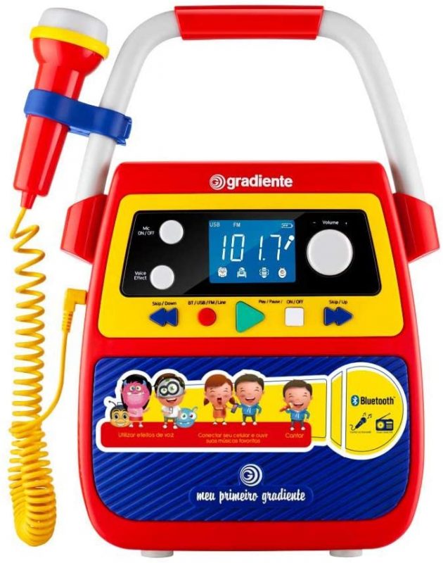 Quem se lembra do Meu Primeiro Gradiente? Isso mesmo! O brinquedo ficou famoso por ser uma espécie de gravador/autofalante portátil, que a criança conectava um microfone, ligava o aparelho e pronto! A versão atual funciona com um karaokê, e o pequeno também tem a possibilidade de sintonizar sua rádio predileta.