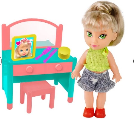 2. Passeio no Shopping veste short, cropped verde e sapato vermelho. A bonequinha vem com penteadeira, banquinho, porta-retrato, porta-joias, escova e pente;