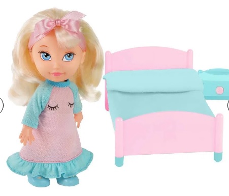 1. Hora de Dormir tem cabelo enraizado, veste camisola, sapatinhos azuis e um laço de fita rosa na cabeça. Ela vem acompanhada de uma cama com cobertor, e uma mesa de cabeceira com abajur e relógio para um sono tranquilo;