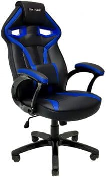 Dá só uma olhada nessa maravilha da MyMax: Cadeira MX1 Giratória, preta e azul. Ela conta com estrutura metálica, superfície com espuma de densidade e PVC de carbono na parte traseira, revestimento com tecido em PU e braços estofados. Suporta até 120 Kg.