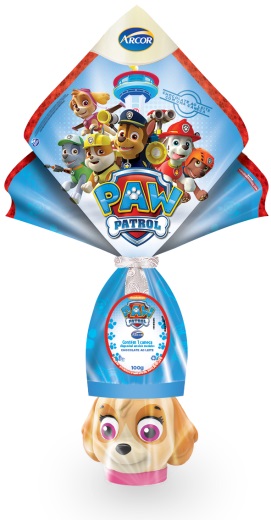 - Ovo de Páscoa Patrulha Canina 100g – Brinde: caneca em formato 3D com a carinha dos personagens Chase e Skye. Fabricante: Arcor. Onde encontrar: Carrefour, Lojas Americanas, Extra, Walmart. Preço sugerido: R$ 44,99.