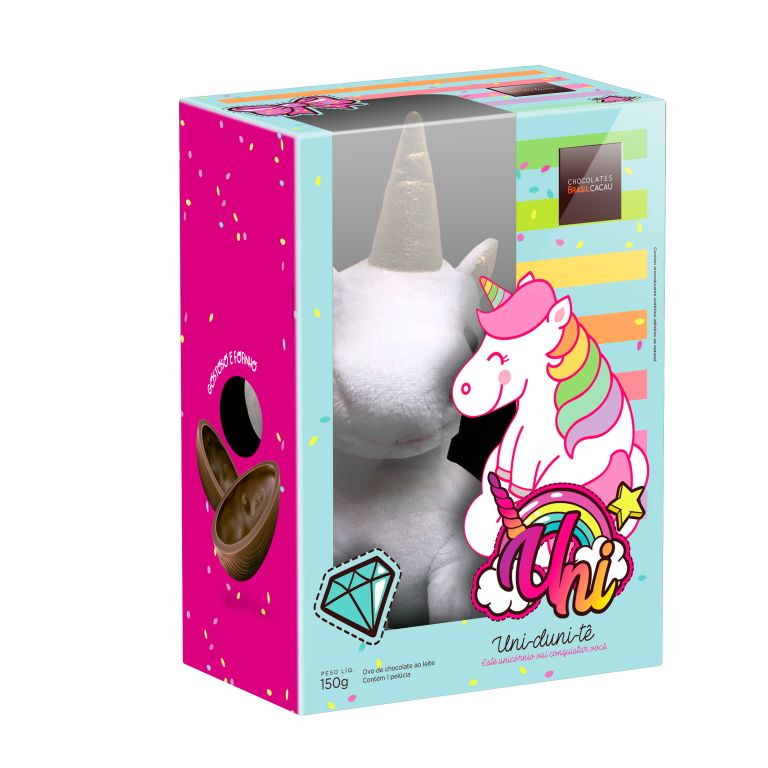 - OVO INFANTIL UNICÓRNIO 150 G (R$49,90) – Ovo de chocolate ao leite com pelúcia exclusiva de Unicórnio;