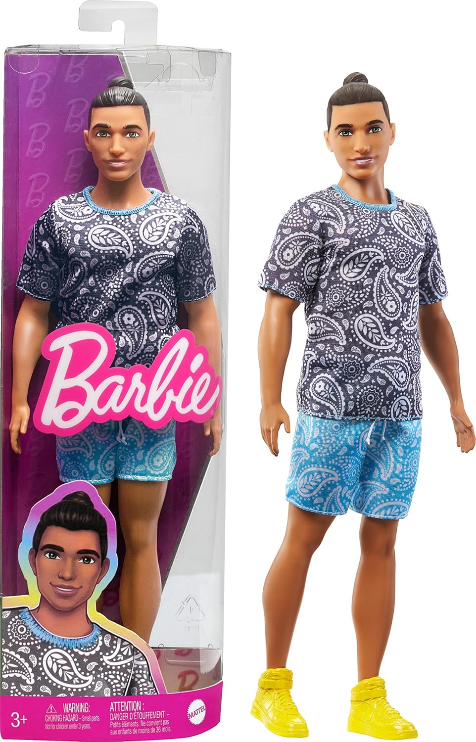 O Boneco Ken Barbie Fashionistas 211 é um loiro estiloso com uma camiseta de cactos azul, shorts branco e tênis. Ele é perfeito para recriar as cenas do filme onde Ken acompanha Barbie em suas aventuras. Este boneco está disponível por R$189,99, podendo ser parcelado em até 3x de R$ 63,33 sem juros. A entrega é gratuita e você pode recebê-lo até terça-feira, 18 de julho.
