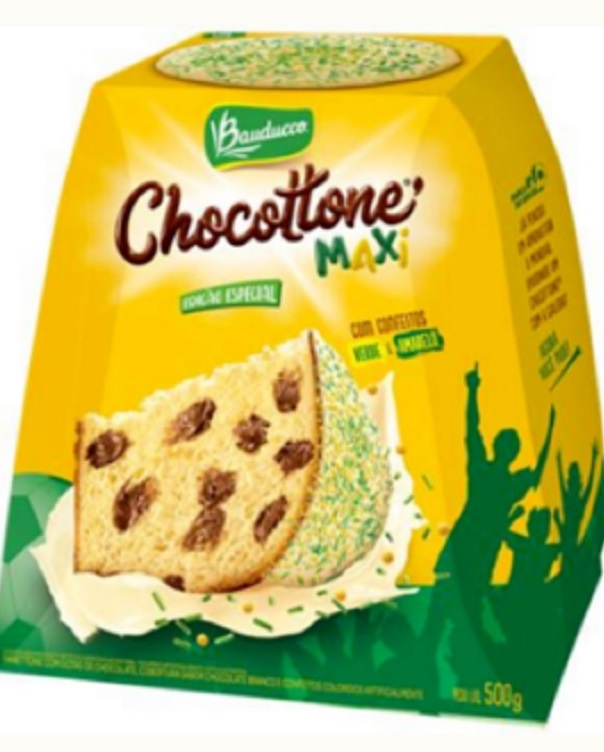O Chocottone Maxi vem com a massa fermentada tradicional e com as gotas de chocolate. O que muda é a cobertura e os complementos: cobertura de chocolate branco com confeitos verdes e amarelos.