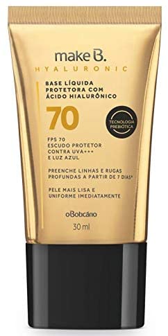 Para arrasar na maquiagem, a base líquida protetora hyaluronic Make B, do Boticário, é a pedida. Estimula a proteção de colágeno, age no combate aos radicais livres, ameniza as linhas de expressão e melhora a textura da pele.