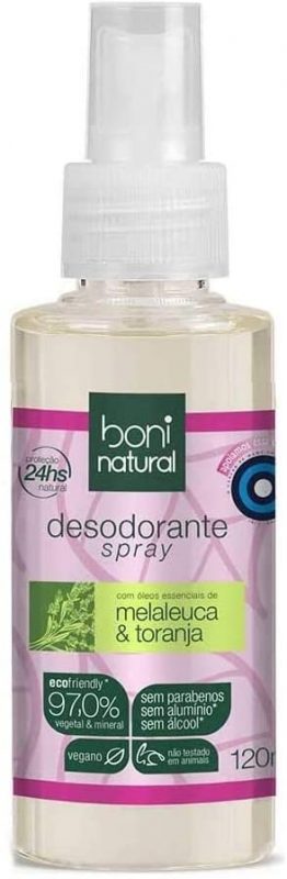 Já o desodorante spray Boni Natural tem em sua fórmula 98,1% de produtos de origem vegetal e mineral, além de propriedades antibacterianas, antifúngicas e anti-inflamatórias, além de neutralização dos odores típicos da transpiração.