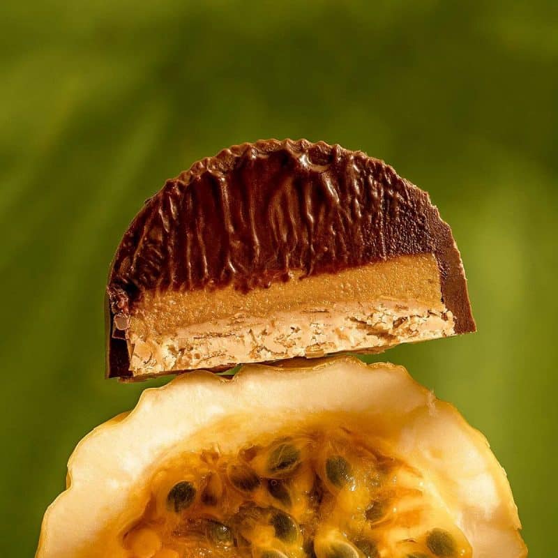 Tronco de chocolate ao leite 50% cacau recheado com ganache de maracujá de massa folhada crocante....