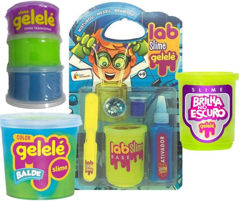 Já o Slime brilha no escuro, kit laboratório Gelelé + 2 produtos é perfeito para os pequenos cientistas. O produto acompanha um balde, ativador e estrelinhas para decorar.Há também o Slime, Kit 2 Brilha no Escuro Slime, Euqfiz, I9 Brinquedos, para fazer slimes que brilham no escuro.