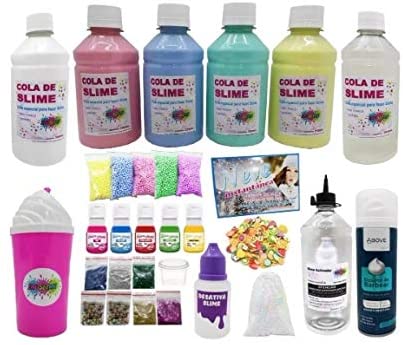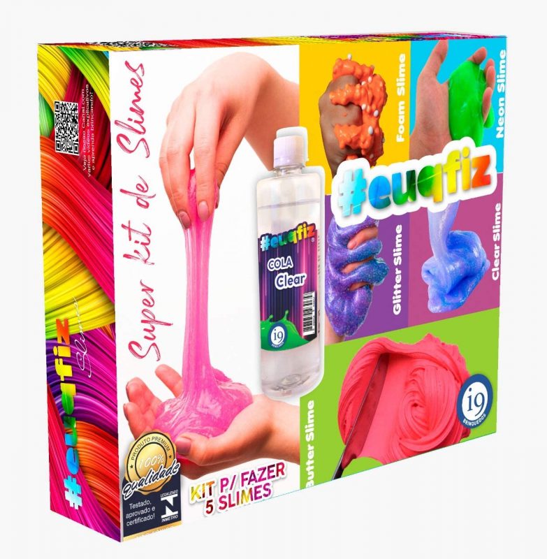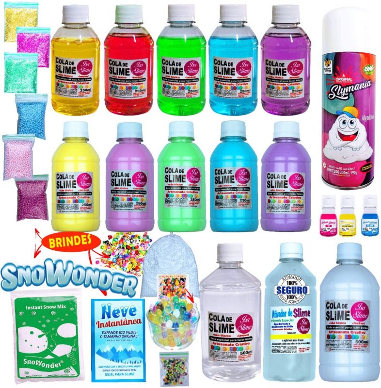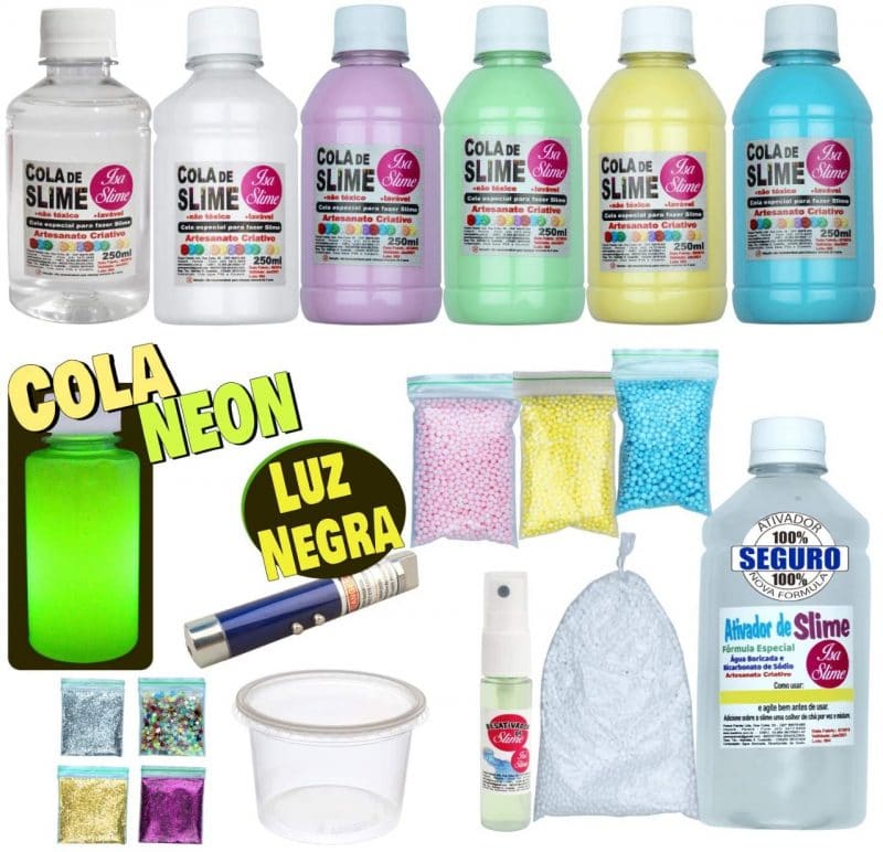 O Kit Para Fazer Slime Premium Isa Slime Original – Snowonder conta com um ativador 100% à base de água boricada e bicarbonato de sódio, além de colas coloridas. Outra opção para os pais é o Super Kit de Slimes, euqfiz, i9 Brinquedos, que dá para fazer até cinco slimes.