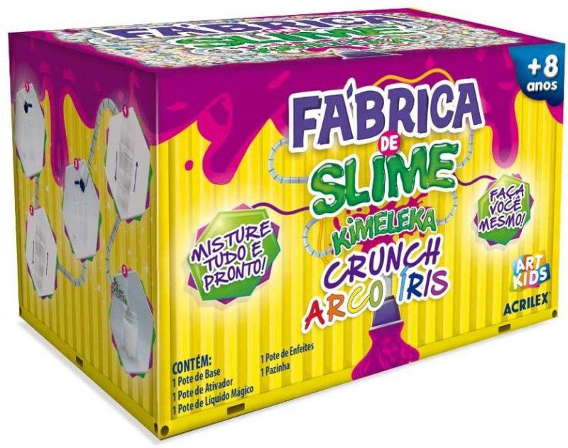Tem ainda o Kit Para Fazer Slime Da Acrilex Kimeleca Crunch Arco Iris, para o pequeno produzir uma fábrica de slime, com um pote de base (60g), um pote de ativador (45g), pote de líquido mágico (45g), um pote de isopor e uma pazinha. As crianças tambḿ podem escolher o Kit Completo Para Fazer Slime + Maleta + Neve-mega Promoção, com uma maleta e colas coloridas.