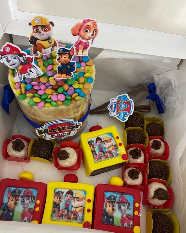 Para os fãs de Patrulha Canina, veja esse festinha na caixa da Doces Tami, que lindos! Vem com bolo, docinhos, cone de chocolate e adesivos ilustrados dos personagens da atração.