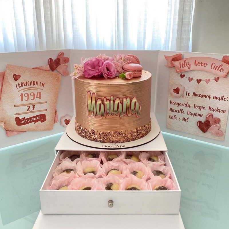 Quer uma confeitaria mais clássica? Veja só que linda essa festinha da Doce Ana Confeitaria. Vem como o bolo, doces finos numa gaveta logo abaixo, além de “murais” com ano de nascimento e mensagem com felicitações.
