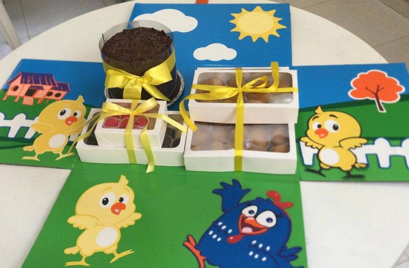 O modelo da Delícia de Bolo na Caixa, com a temática da Galinha Pintadinha, é uma boa pedida para os fãs da personagem. O bolo, os salgadinhos e docinhos vêm centralizados no “cenário”, que se abre em quatro partes com ilustrações de uma fazenda, da Galinha e seus amiguinhos. Que tal?