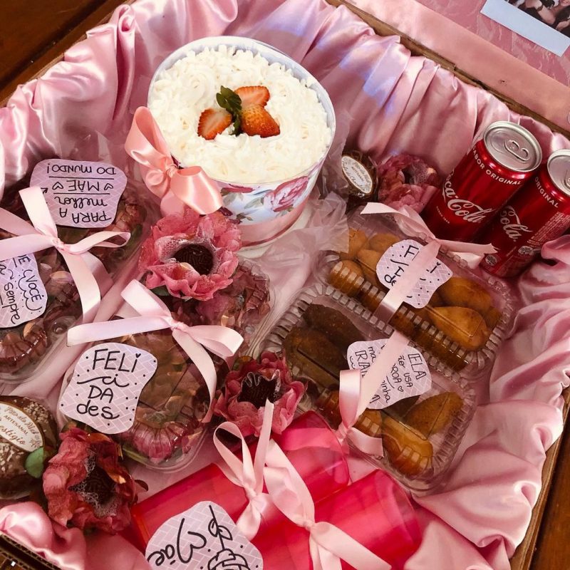 O Festa na Caixa Osasco tem um modelo muito fofo, com uma caixa toda forrada com tecido acetinado da cor desejada, e as guloseimas repousadas sobre ele: bolo confeitado com laço de rosas, vasilhas com doces e salgados que recebem bilhetinhos de felicitações em cada um deles, além de refrigerante e copinhos de acrílico.