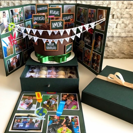 Dá só uma olhada no capricho do Bolo da Lais. Ele acompanha, além do bolo, caixinha estilo gaveta de docinhos sortidos e cenário que pode ser decorado com a foto do aniversariante nas duas abas laterais.