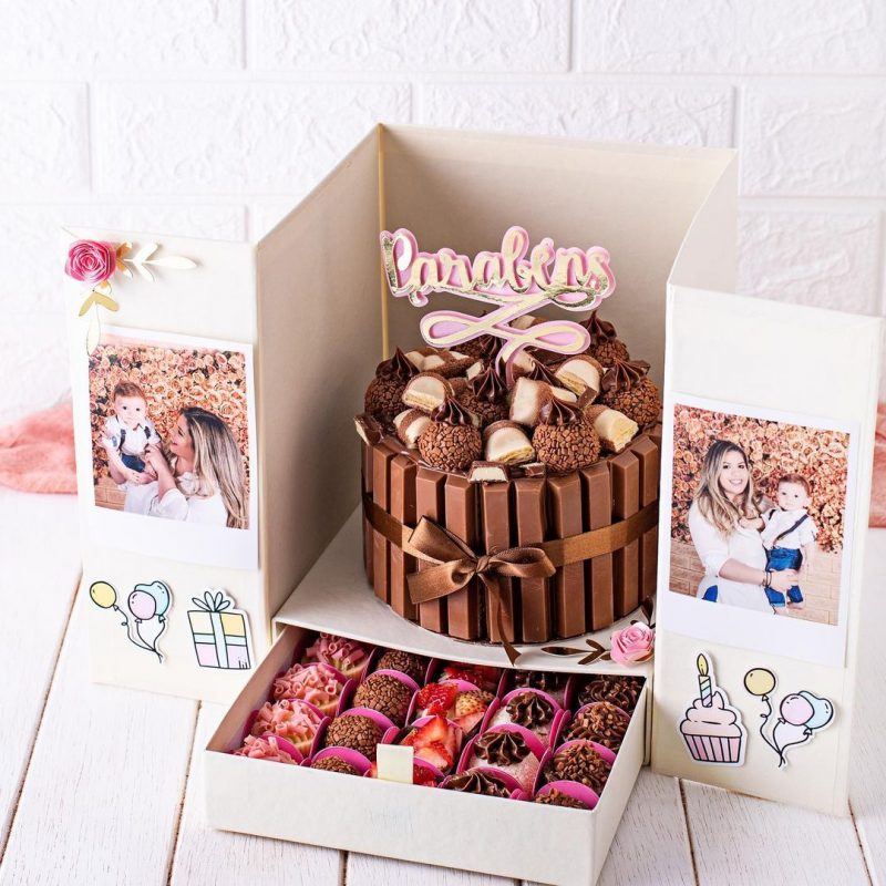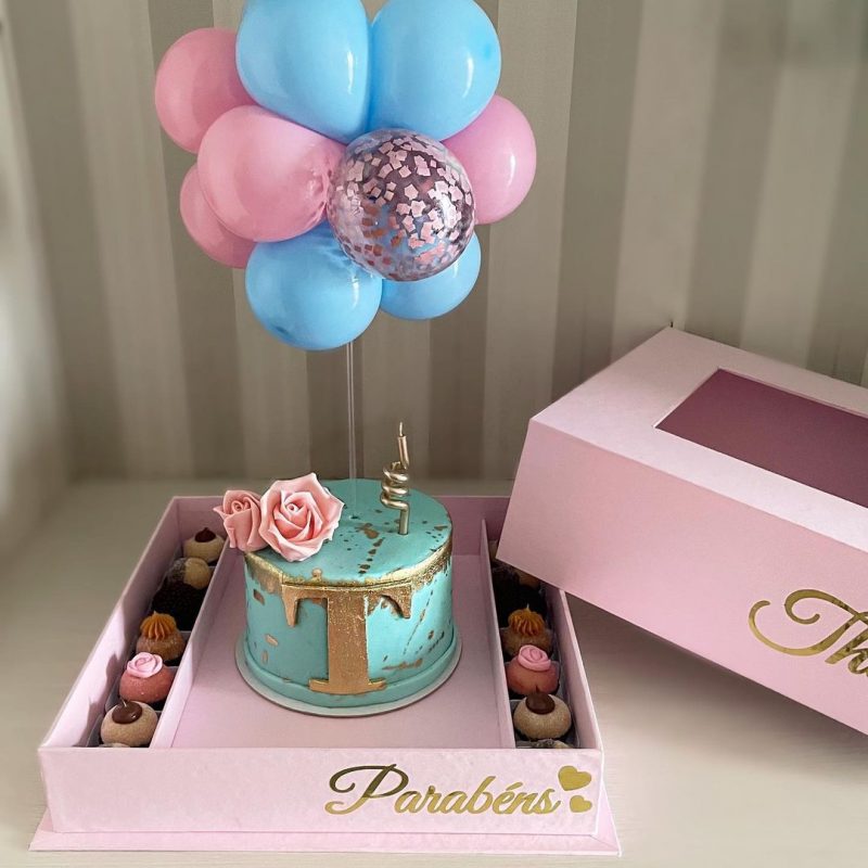 Já esse modelo, da Vai na Caixa, é um pouco diferente: o bolo fica centralizado numa plataforma quadrada e, em ambos os lados, os docinhos descansam numa num compartimento vertical. O kit também vem com balões personalizados que ficam acoplados ao bolo. Lindo!