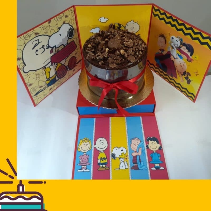 A Sonia Lira Bolos, além de projetos enormes para festas de casamento, também confecciona as festas na caixa, como esse modelo do personagem Charlie Brown. O bolo é centralizado, envolto com uma lâmina prata que lembra um espelho, segura com um laço vermelho. Ao redor, encarte com animações dos personagens, gavetinha com doces diversos e, mais a frente, um card com a foto de toda a turma!