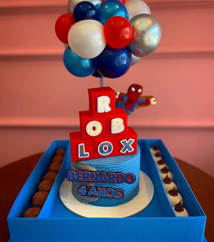 Este formato também é utilizado pela Sugar Bakery Sweet. Neste projeto, o tema central foi o super-herói Homem Aranha, com a miniatura do personagem escalando o bolo e balões nas cores de seu uniforme. Isso sem contar os docinhos sortidos nos compartimentos nos dois lados do bolo.