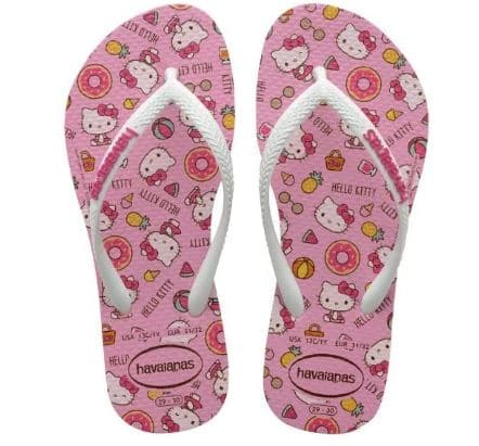 Seja para ficar em casa ou dar uma volta por aí, ainda mais no calor, as Havaianas da Hello Kitty é a melhor opção. Feita com sola de borracha e tira 100% em PVC, tem o rostinho da boneca estampada em toda a sua extensão.