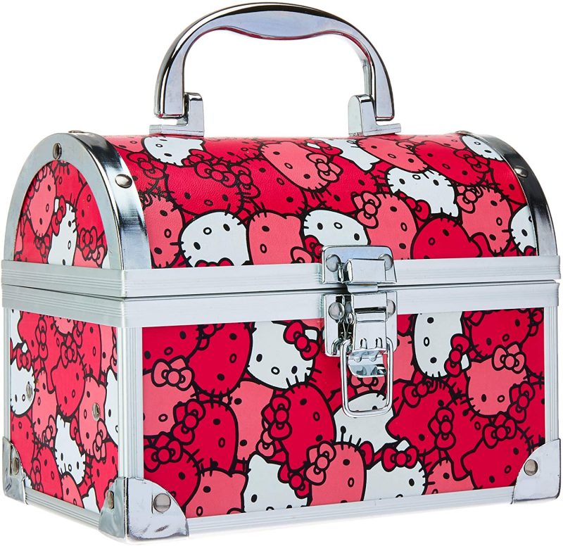 Para guardar as bijuterias, a dica é a maleta baú Hello Kitty Faces. Na cor rosa, tem estampada o rosto da personagem na estrutura de alumínio. Tem alça para facilitar o transporte e fecho, também feito em alumínio.