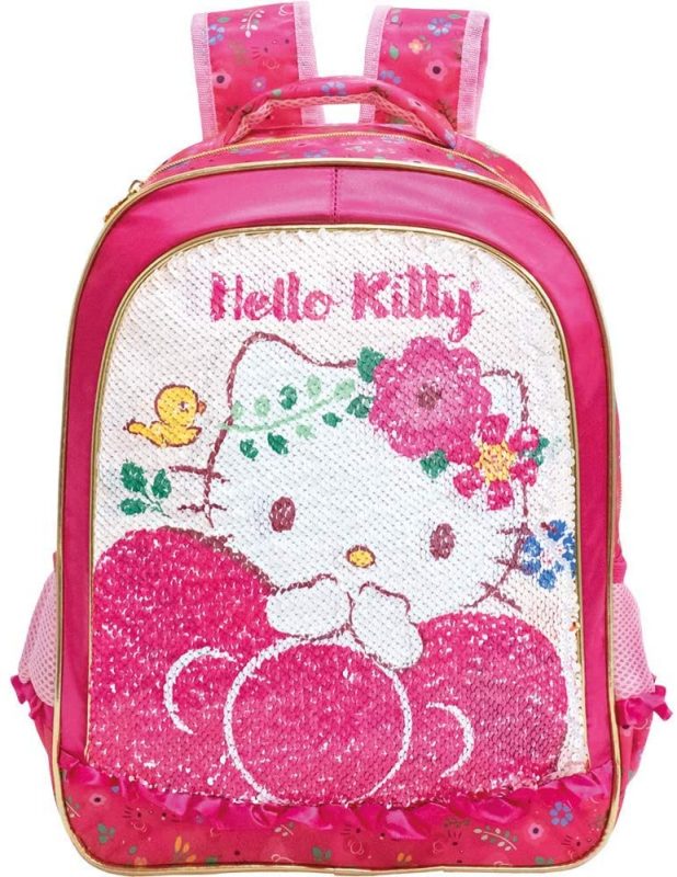 As aulas já começaram, mais ainda há tempo de trocar a mochila por uma personalizada com lantejoulas reversíveis que formam duas imagens da personagem. Tem bolsos laterais e um compartilhamento espaçoso, alças acolchoadas e detalhes em babadinho. Para levar na bolsa, não poderia ser diferente: caderno universitário de 10 matérias, capa dura com foto da Hello Kitty e 160 folhas.