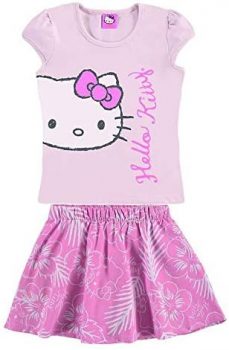 Para compor o look despojado, a dica é esse conjuntinho, com camiseta e shorts-saia da Hello Kitty. Na cor rosa, traz estampas exclusivas da personagem nas duas peças.
