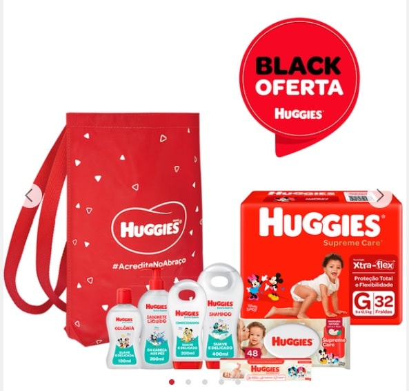 Na compra do kit com a linha completa Huggies, que inclui pacote de fralda, lenço umedecido, creme de assadura, shampoo, condicionador, sabonete líquido e colônia, o consumidor ganha uma bolsa exclusiva da marca. O valor do kit era de R$144,99, e agora está em R$115,00, disponível de forma online na plataforma Mais Abraços da marca. Para adquirir o kit completo de Black Friday da Huggies, será apenas necessário o cadastro na plataforma, que além de produtos, também contém diversas informações para as famílias, além de descontos exclusivos.