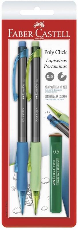 Já a Faber-Castell dispõe do kit Lapiseira Poly Click, com duas unidades nas cores azul e verde. Possuem acionamento lateral para regular a saída do grafite e são emborrachadas na altura da “zona de agarre”, o que aumenta a aderência nos dedos.