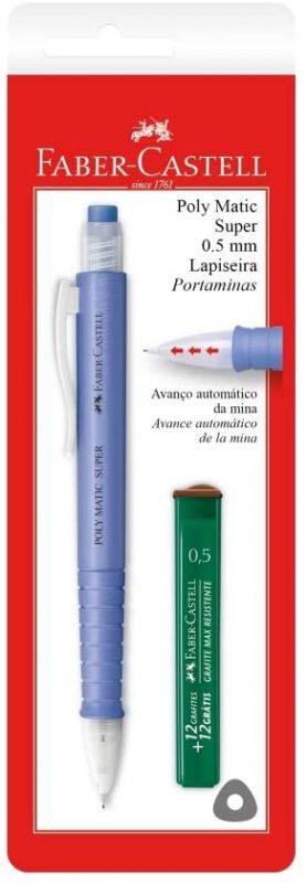 Outro modelo da Faber-Castell é a lapiseira Poly Matic Super. Em cores variadas, possui tecnologia Matic, com avanço automático do grafite na medida em que há o desgaste da ponta, além de borracha colorida na extremidade com sistema de extensão.
