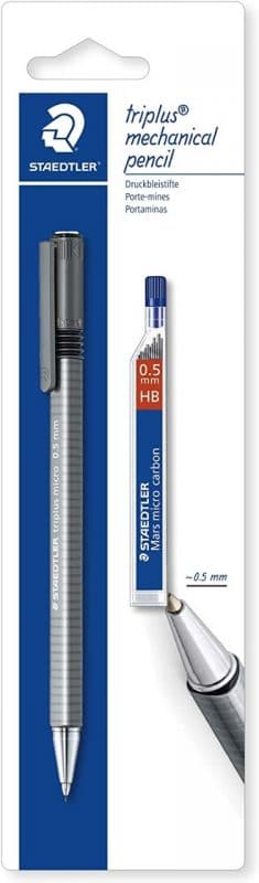 A Staedtler oferece o modelo Triplus. A lapiseira tem a cor cinza feita em polipropileno, que lhe dá leveza acima da média encontrada no mercado. Outro diferencial da marca é o sistema de amortecedor de impacto, que dá maior resistência do grafite no momento do uso.
