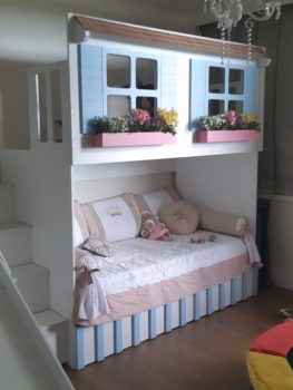 A partir daí vieram os novos desenhos para brinquedotecas e a evolução para vários padrões de tricamas em formato de casas, cabanas ou com mezanino fechado por cordas. Todos acompanham uma prática e segura escada com degraus-baú, além de opcionais, como grade de proteção e escorregador para um acordar mais divertido!